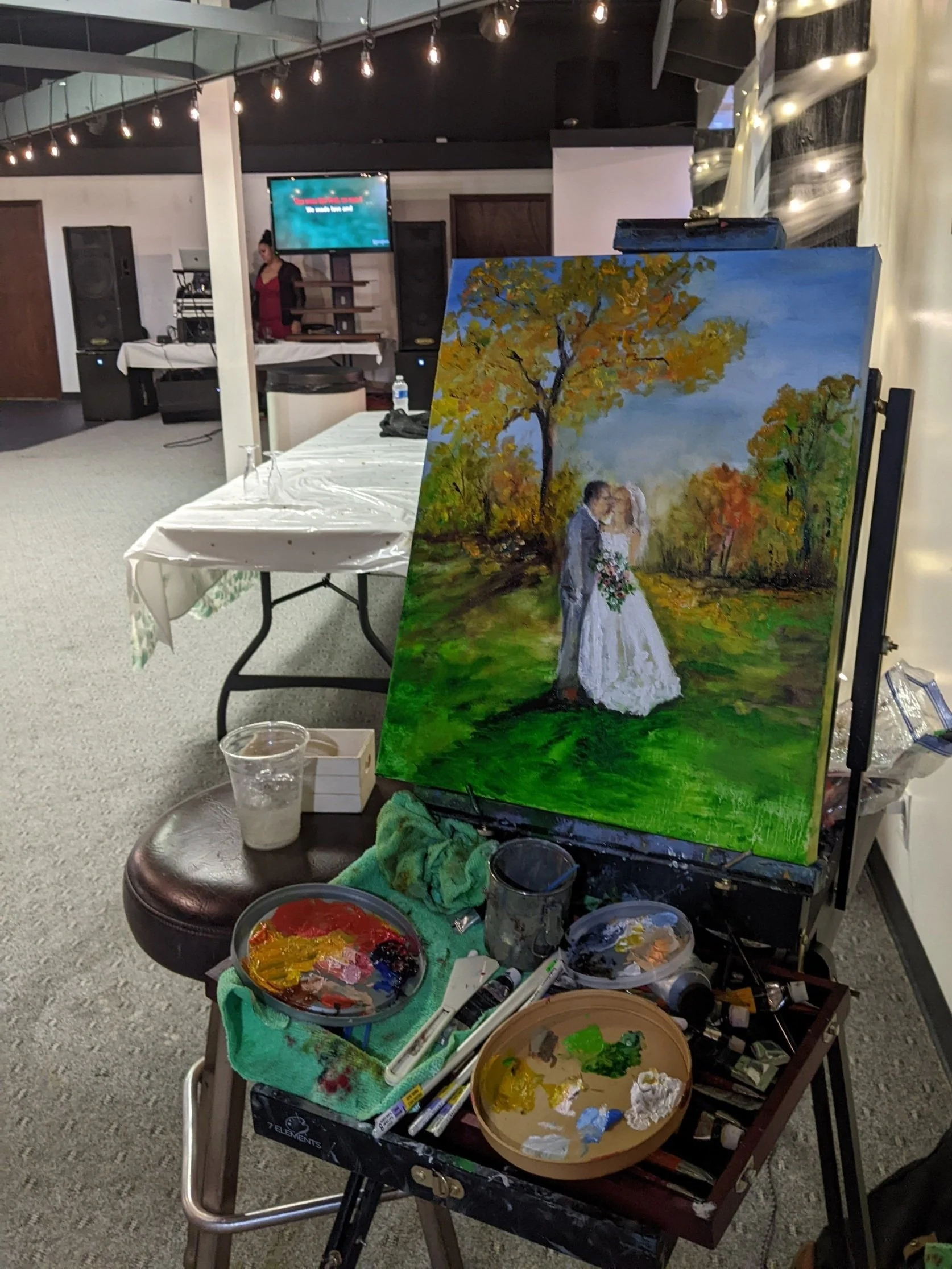 I will continue to paint through the ceremony and reception. I am easily able to move my easel and paints to multiple locations throughout the event.